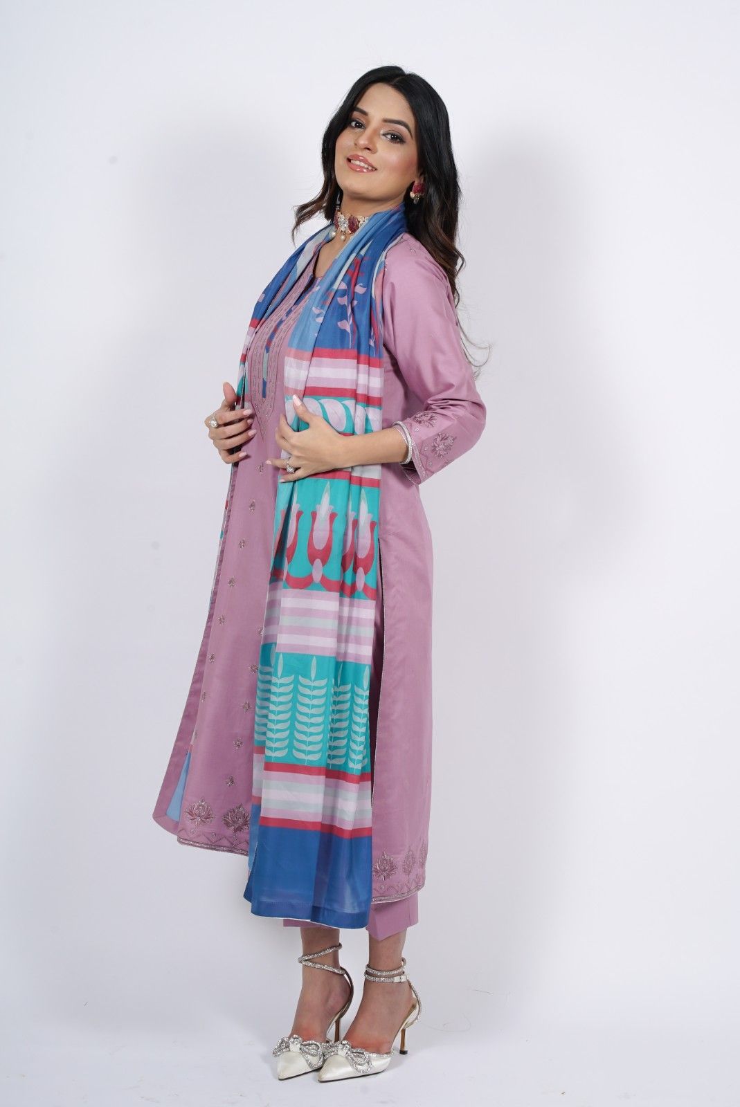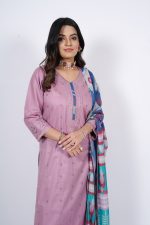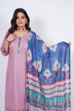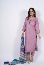 Introducing our highly anticipated Eid luxury lawn collection, “MANHANI,” we present to you the exquisite ambrosia pink embroidered dress. This stunning ensemble features a lawn shirt and trouser, accompanied by a silk dupatta. The shirt is beautifully adorned with an embroidered neckline, showcasing intricate geometric lines. The sleeves and border are also embellished with geometric patterns, including lines, zigzags, and delicate flowers. The shirt itself is adorned with seamless floral motifs that create a captivating visual appeal. The trousers, on the other hand, are elegantly plain, allowing the shirt to take center stage. The silk dupatta complements the shirt perfectly, featuring a classic contrast with a combination of floral and geometric prints in a consecutive style. This dress exudes a timeless charm and is a must-have addition to any wardrobe, providing a touch of classical elegance.