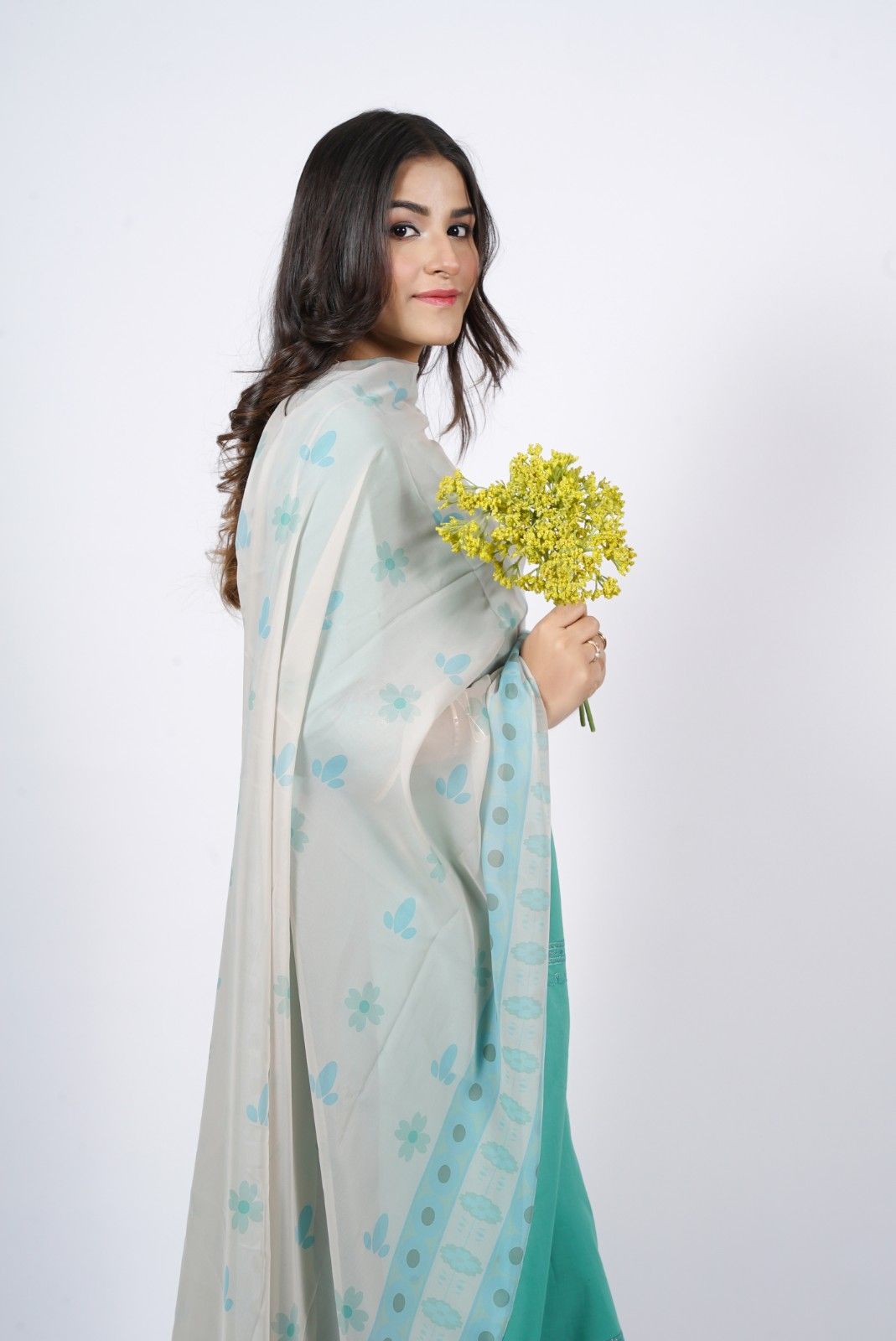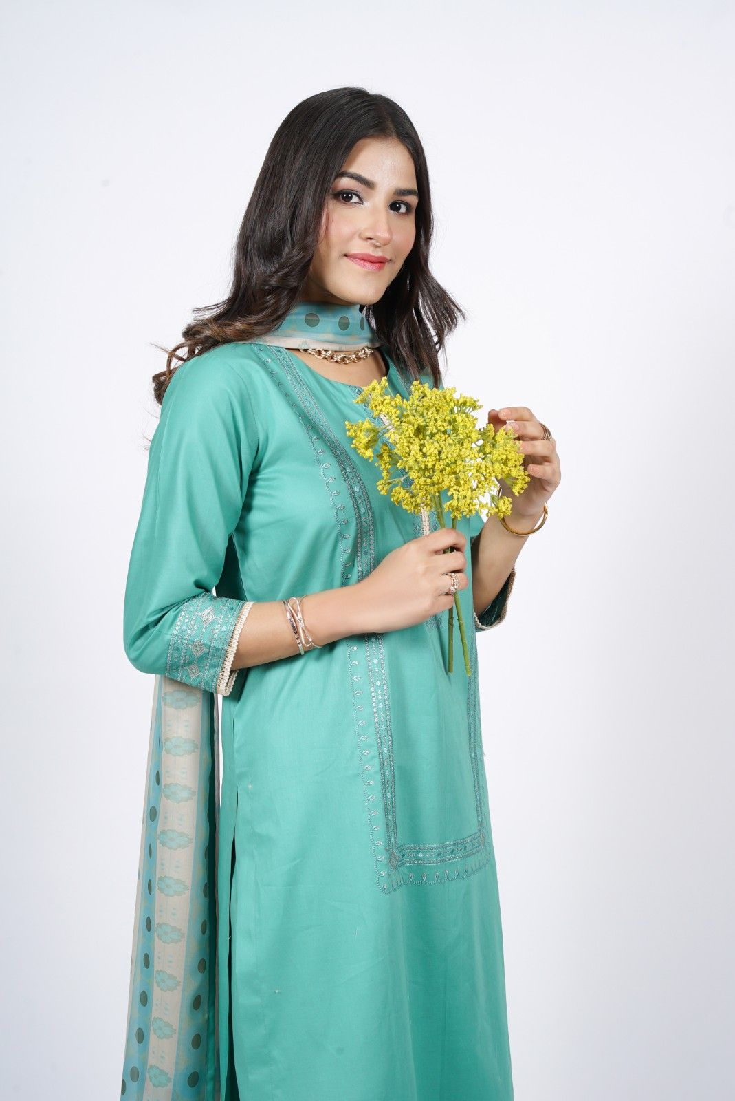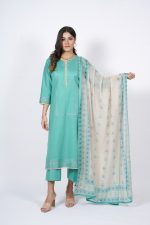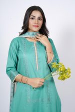 Introducing our highly anticipated Eid luxury lawn collection, “MANHANI.” Feast your eyes on the exquisite Clasigo Green embroidered dress, featuring a flawless combination of a lawn shirt, trouser, and silk dupatta. The shirt boasts a rectangular-shaped embroidered neck, adorned with delicate embroidery on the sleeves and a border showcasing a tasteful blend of floral and geometric patterns. The contrasting skin-colored dupatta adds a touch of elegance to the ensemble, enhanced by a timeless and classic print. This dress exudes a simple yet refined appeal, making it the epitome of sophistication and ensuring that you stand out effortlessly.