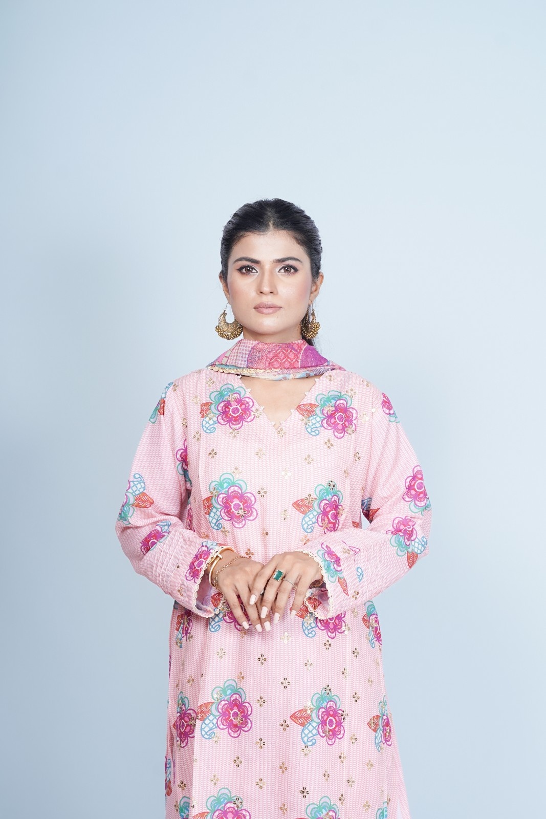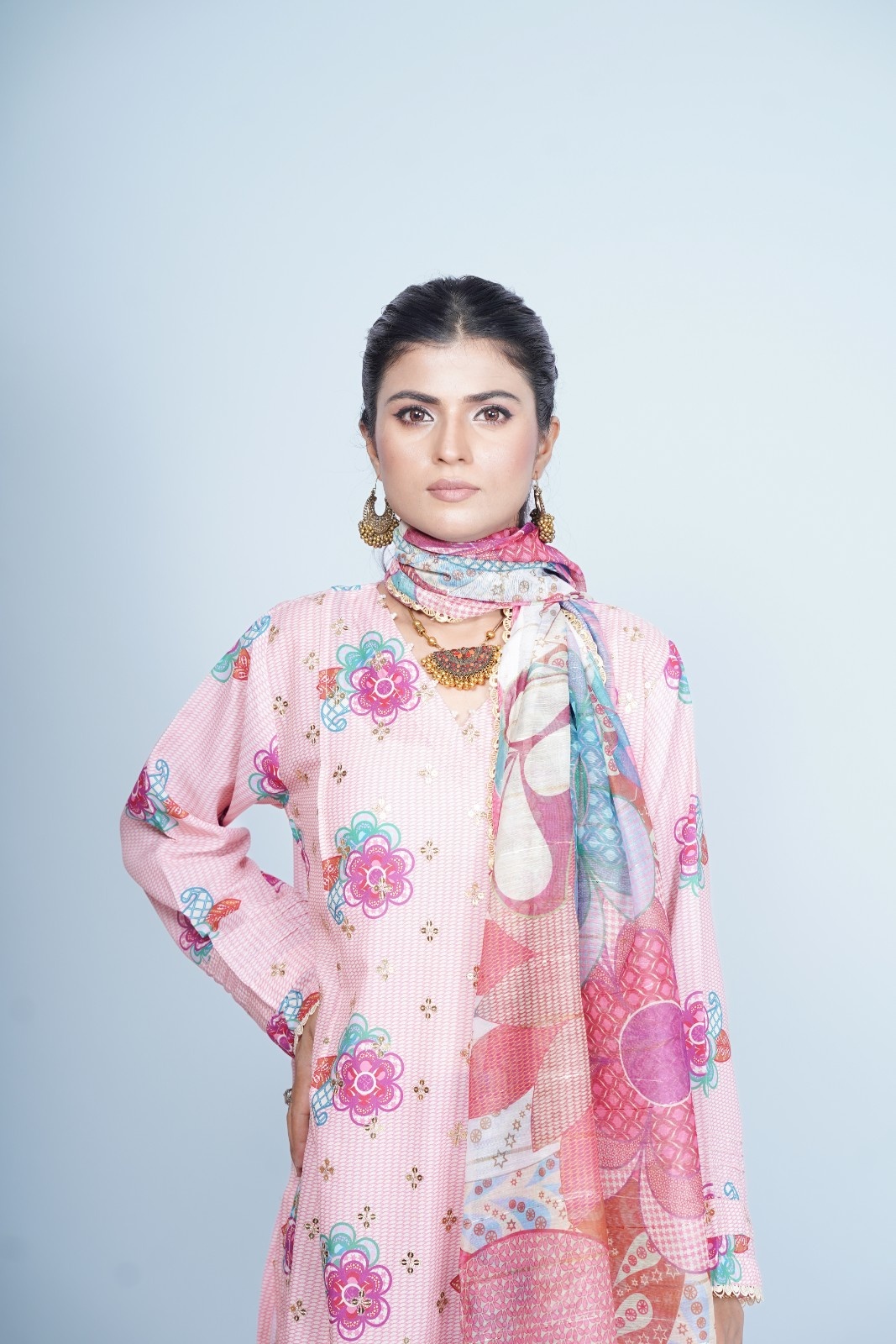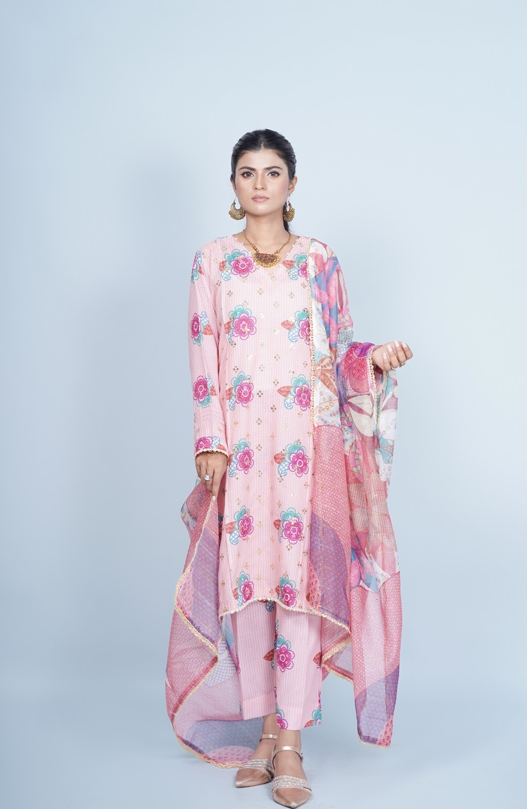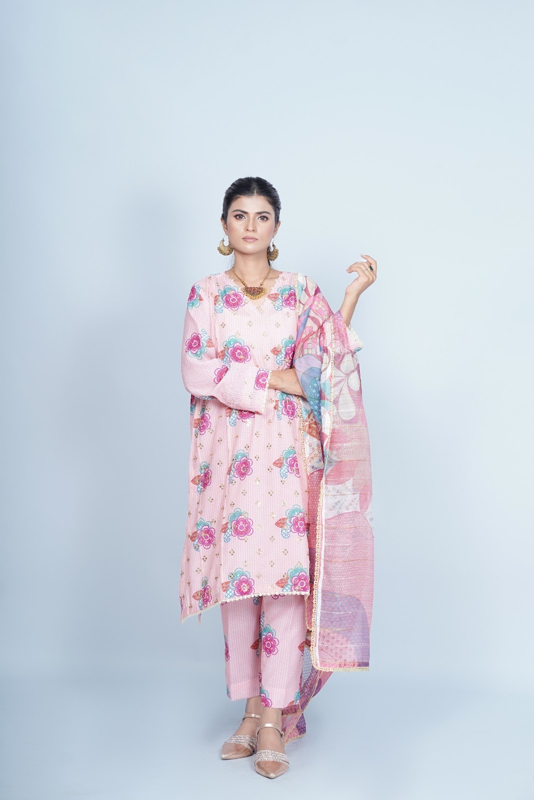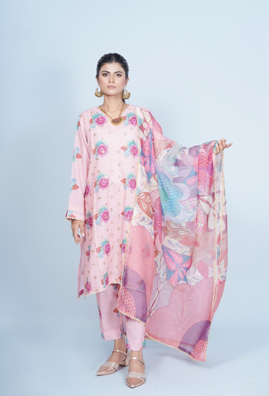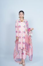 Paired with matching trousers that mirror the kurta’s floral motifs, this outfit offers a cohesive and stylish appearance. The dupatta is a true highlight, featuring a blend of floral and abstract patterns in complementary hues of pink, lavender, and turquoise. The sheer fabric of the dupatta adds a graceful flow to the ensemble, making it a perfect accessory to elevate the overall look.