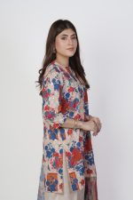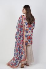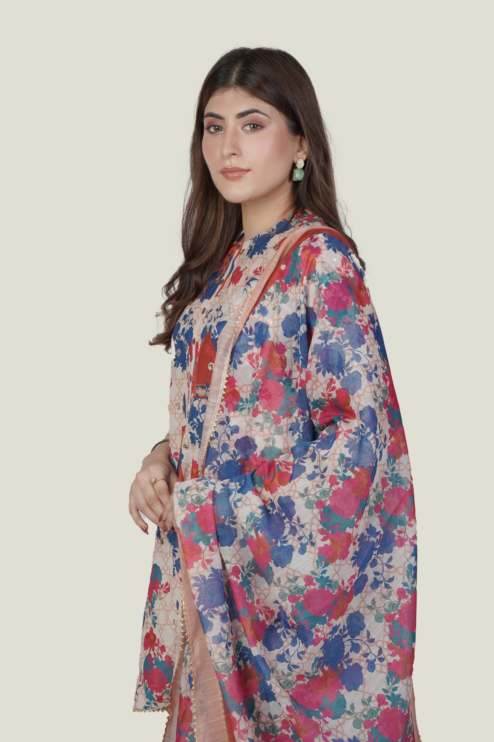 An elegant soft pink with ivory undertones. pinkish ivory trump shirt adorned with a delicate floral with fusion of animals. A warm, powdery hue with a whisper of rose, perfect for elegant prints paired with a plain trouser for a refined look and over all Machine embroidery in Shirt. Munar printed soft breathable cotton dupatta features intricate patterns.