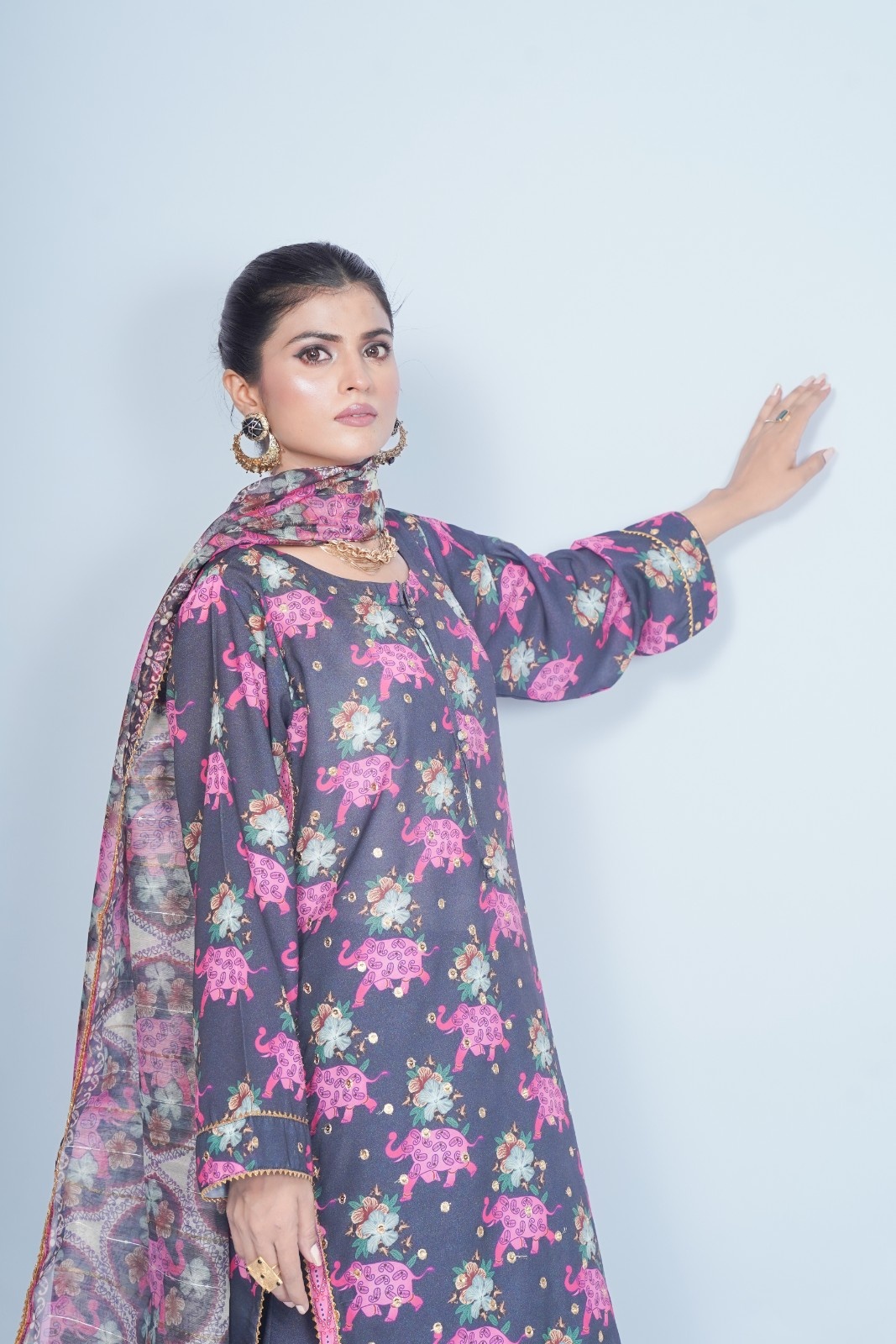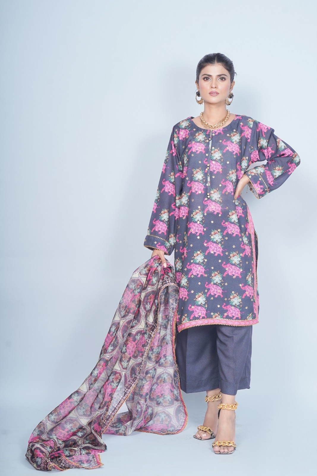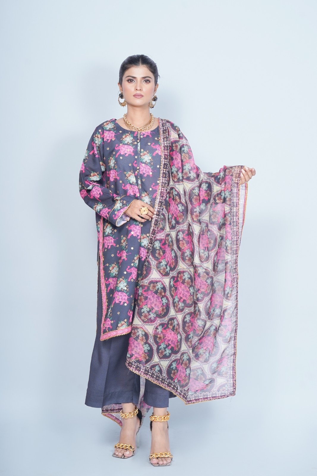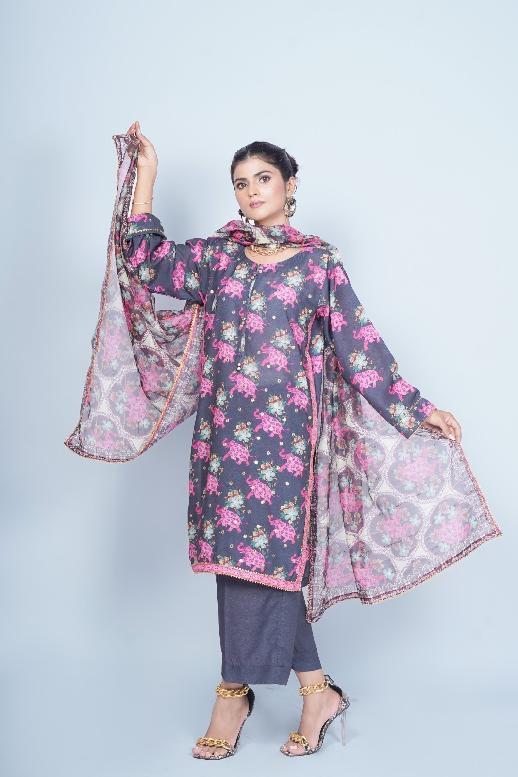 Add a touch of adventure to your wardrobe with our bold 3-piece suit, featuring a vibrant floral and elephant print on black fabric. Muted green tones and pink bring warmth to the design, while done with golden embroidery around the sequin look a playful touch.