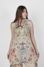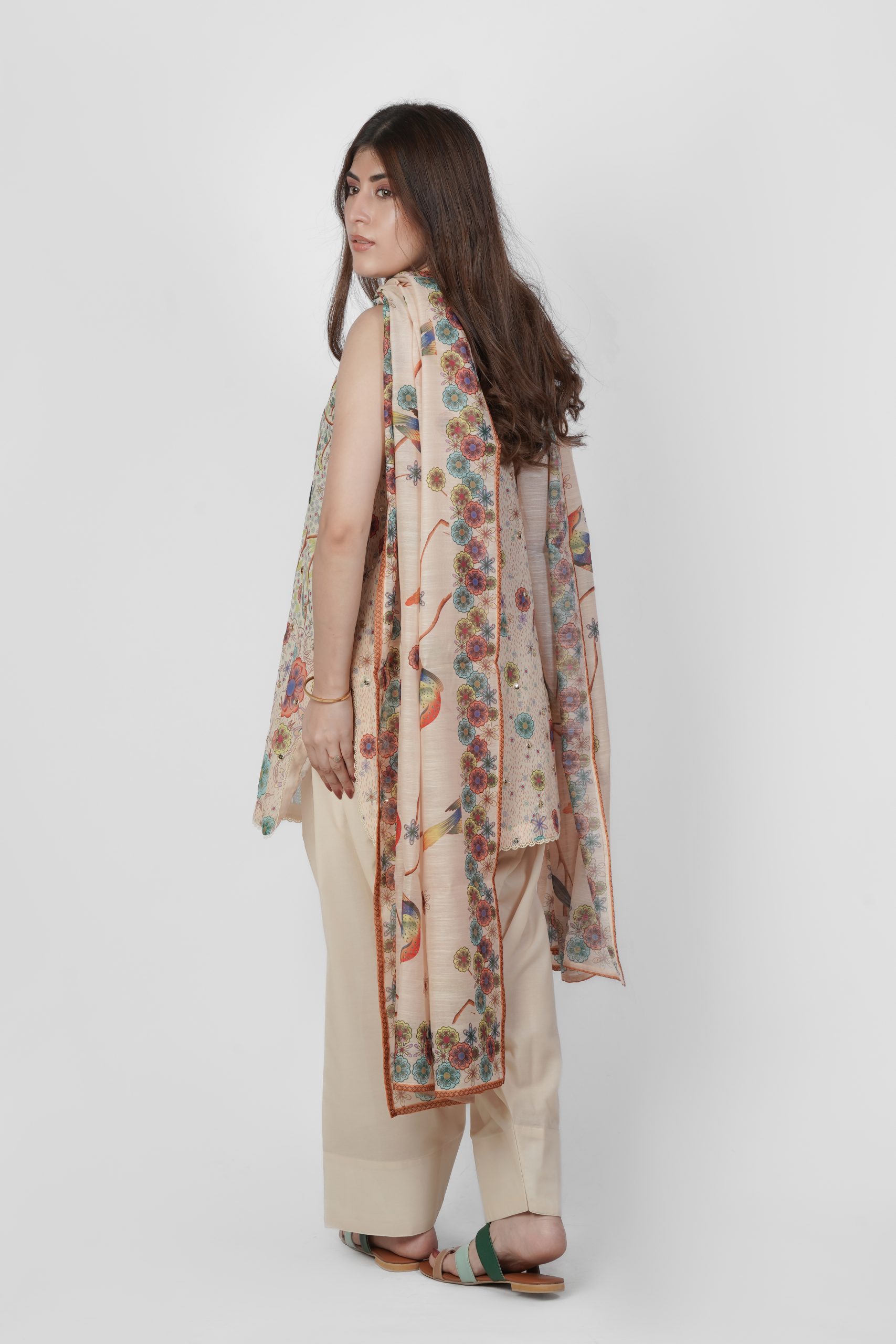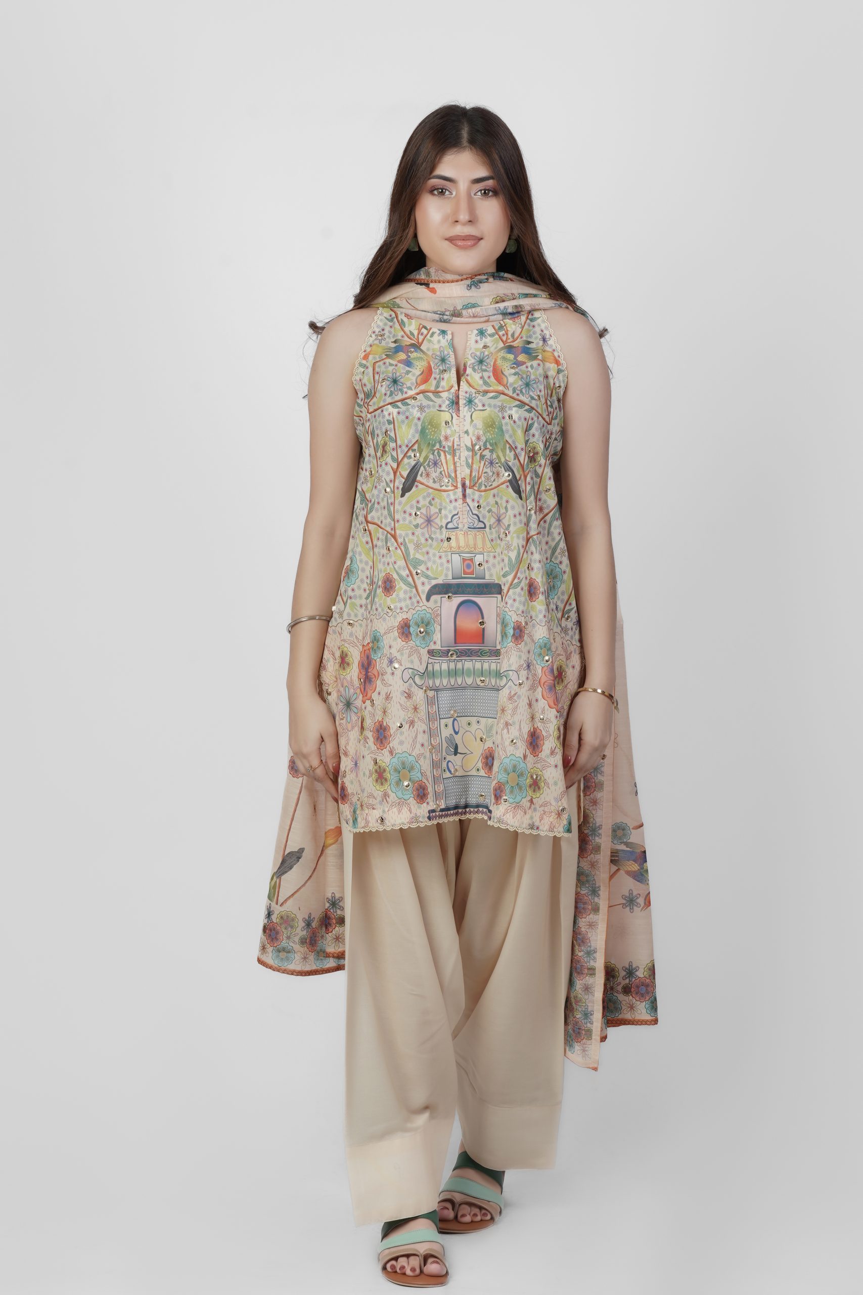 A graceful ensemble featuring elegant Bagoda print in a soft blend of multi and skin tones. Tila Jallebi, a traditional embroidery style with swirling patterns, is highlighted with simple sequins for a refined touch. Paired with plain skin-toned trousers. Crafted from breathable cotton, the Munar print dupatta showcases intricate patterns that complete the look beautifully. This outfit ensures both comfort and sophistication.