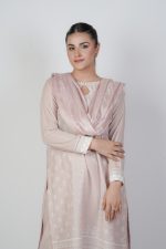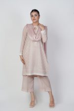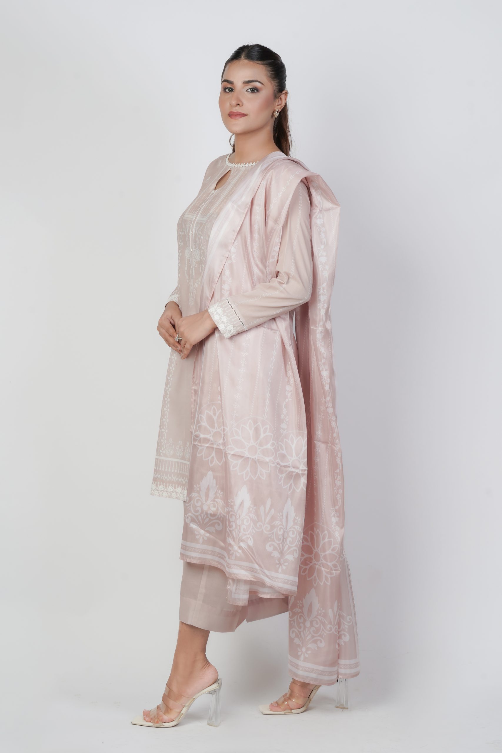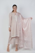 An elegant skin elegancia color shirt adorned with a delicate floral print, paired with a plain skin trouser blending soft hues with timeless charm for a refined and graceful look and completed with a luxurious silk floral printed dupatta, adding grace and timeless charm. Beautifully enhanced with net and intricate net embroidered lace creating a perfect blend of delicacy and timeless style.